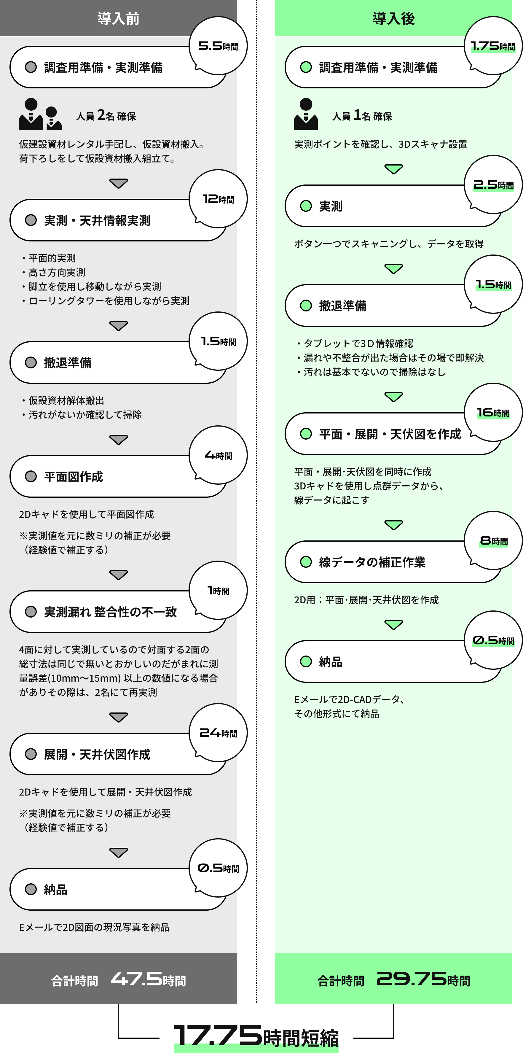 実測にかかる時間を短縮でき、現場の負担も軽減されます。 さらに、実測漏れのリスクも最小限に抑えられます。