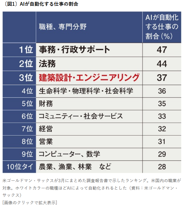 トップページ > お知らせ&お役立ちブログ > 「AIが奪う仕事」3位は建築設計 「AIが奪う仕事」3位は建築設計 2025.08.19 お役立ちブログ 日経クロステックの以下の記事で、掲載されておりました。 https://xtech.nikkei.com/atcl/nxt/mag/na/18/00204/041800002/